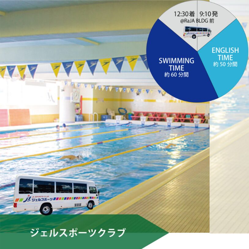 高麗町のスクールから専用バスで鹿児島市明和のジェルスポーツクラブへ移動し、まずは英語の先生と楽しいレッスンタイム!歌や会話、ゲームを通して自然に英語に触れたあと、水泳の先生がやさしく泳ぎを指導します。