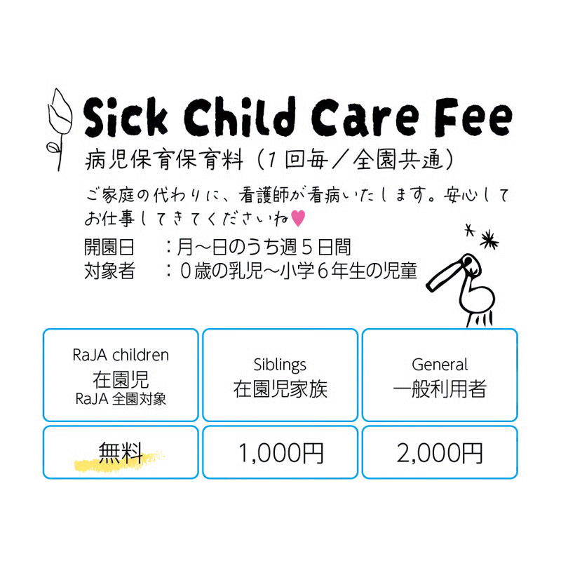 下荒田の園では、病児保育を実施しております。同時にお預かりできるのは、2名のお子様まで。こちらは、0歳の乳児から小学6年生までご利用可能です。利用が想定される方は、事前にご登録いただきますと、万一の際にスムーズにご利用になれます。